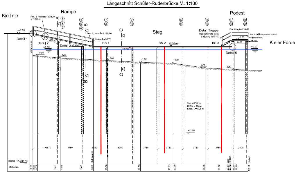 Die Schüler-Ruderbrücke an der Kiellinie muss erneuert werden. Die vorhandene Holzkonstruktion ist stark angegriffen und wird durch eine Stahlkonstruktion mit GFK-Belag ersetzt.