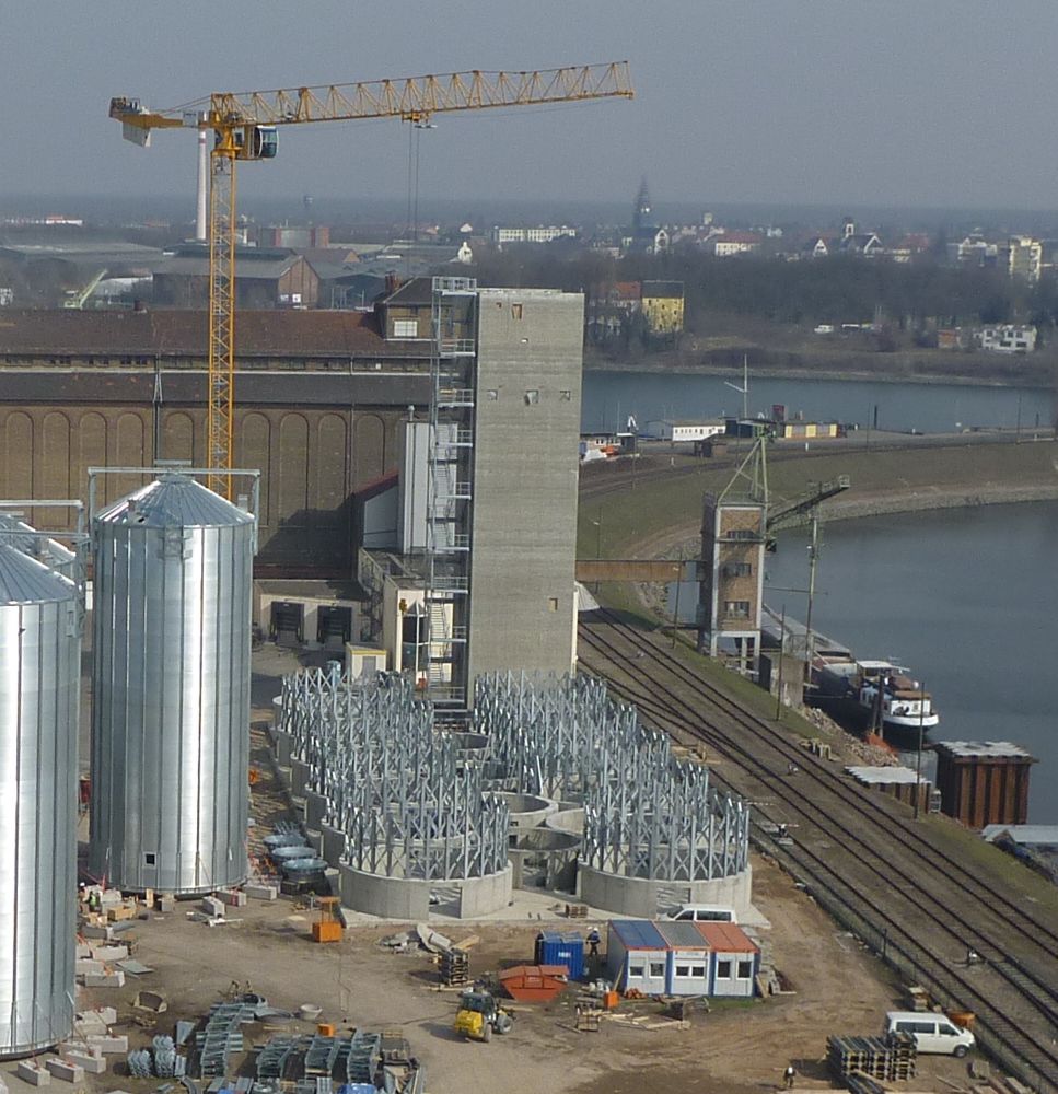 Stahlsilos auf Pfahl-Plattengründung einer Getreidesiloanlage in Erdbebenzone II, Maschinenhaus wurde in Gleitbauweise in einem Zug erstellt.